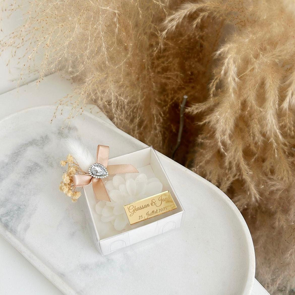Pour une expérience optimale, nous vous recommandons de retirer délicatement vos cadeaux invités du papier bulle dès réception. Cela garantit qu'ils restent parfaits pour sublimer vos occasions spéciales